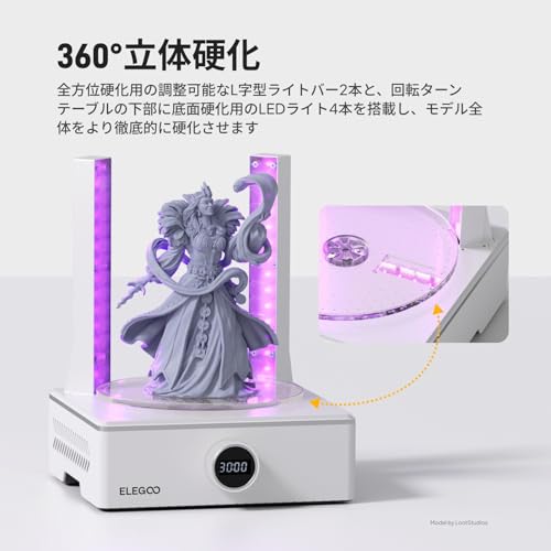 ◆【360°オールラウンド露光】後硬化ステーションは2つのL字型ライトバー(それぞれ14個のUV LEDライトを内蔵)を採用し、ターンテーブルの下に4つのUV LEDビーズを追加しました。 360°自動回転するターンテーブルと3D プリントの隅々まで硬化する手持ちのUV ランプを使用して、モデル全体が行き止まりなく完全に硬化されるようにします。