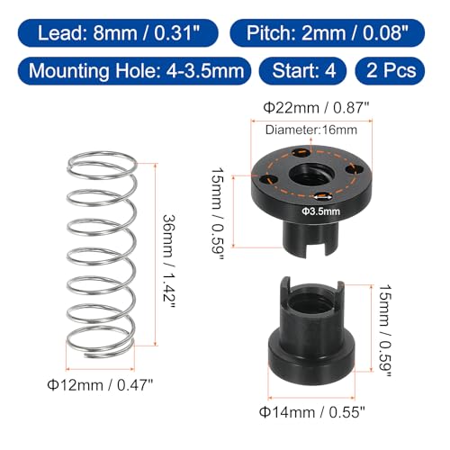 ◆[ギャップナットの排除] 素材:POM;モデル:Tr8;スタート:4;リード:8mm/0.31インチ;ピッチ:2mm/0.08インチ;取り付け穴:4-3.5mm;ナットサイズ:15x14mm/0.59インチx0.55インチ(長さ×幅);15x22mm/0.59インチx0.87インチ(長さ×幅)
