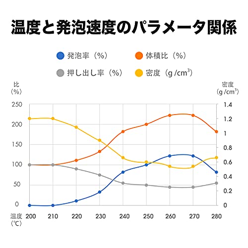 ◆【低密度・高発泡体積比】ePLA-LWはアクティブ発泡技術を採用し、軽量・低密度のPLA部品を実現しています。発泡体積比が最も高いのは220%で、同じ体積モデルを印刷する場合、ePLA-LW1ロールを通常のPLA2.2ロールとして使用できます。密度はわずか0.54g / cm3です。