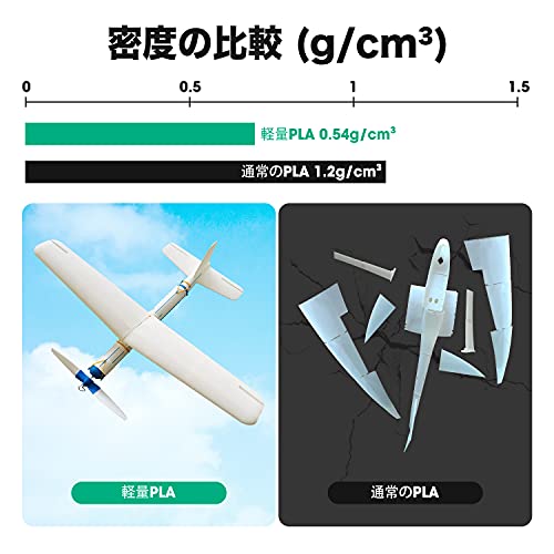◆【印刷時の発泡】約210℃〜270℃で、このフィラメントは印刷中に発泡し始め、その体積が約1.2倍に増加し、印刷押出率を45%に低減して軽量部品を印刷することができます。同じモデルと印刷速度の場合、ePLA-LWを使用すると、模型飛行機の翼面荷重を軽くし、失速速度を遅くすることができます。飛行機などのモデルでは、バランスの取れた強度の条件下で、重量を減らすことで飛行機の性能を大幅に向上させることができます。