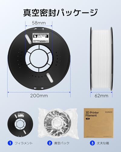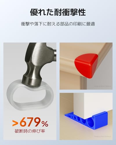 ◆【優れた耐衝撃性】ELEGOG TPU 95Aは、優れた耐衝撃性を備えたソフトフィラメントで、繰り返しの衝撃、衝突、偶発的な落下にも耐える部品の作成に最適です。