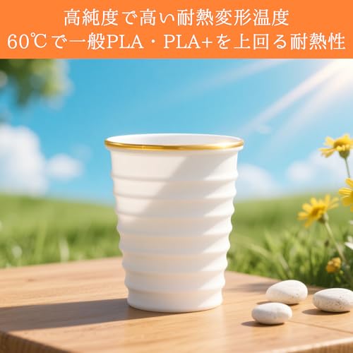 ◆✅ 高純度・より高い耐熱変形温度 PRINSFIL GO PLAは、原料の化学構造と純度により、熱変形温度60℃を実現しています。 これは、一般的なPLAやPLA+と比べて優れた耐熱性を示します。
